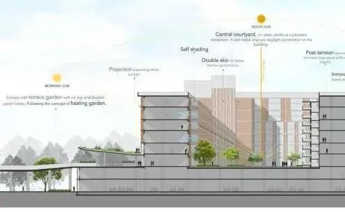 Symbiosis大學醫院和研究中心(SUHRC)占據Symbiosis國際大學在Lavale占地260英畝土地的山坡上,這是一家占地41,800平方米,擁有216張病床的多專科醫院,代表著一個嶄新的,進步的面貌印度的醫療保健基礎設施。憑借其最先進的醫療保健設施和增強技能開發的研究中心,它已牢固地立足成為COVID-19檢疫和治療設施,為馬哈拉施特拉邦抗擊疫情做出了貢獻。SUHRC的設計借鑒了親生物的思想(人類與生俱來的與自然和其他生命形式聯系的先天傾向),以促進患者和醫療保健專業人員的康復和復興。兩個開花的灌木叢和樹木環繞的大型庭院為室內帶來充足的日光和室外景觀,同時創建緩沖區以減少交叉感染。諸如重癥監護病房這樣的關鍵區域具有柔和的色調,以減輕焦慮。OPD沒有空調,但可以提供新鮮自然的空氣-從而減少了這些區域的氣流負載和功耗。從功能上講,該建筑包括四個部分。其中三個屬于醫院,最后一個是技能中心。醫院計劃分為五個級別;諸如OPD,傷亡,放射科,MHC等部門。