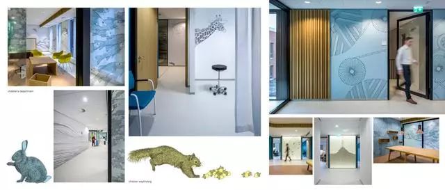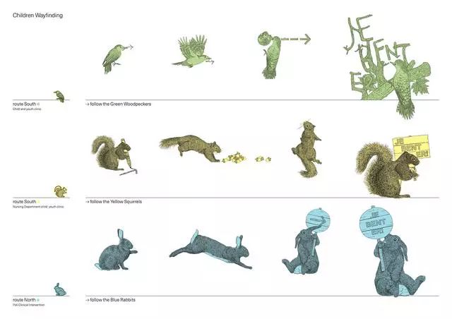 這個(gè)醫(yī)院還特別為孩子們?cè)O(shè)計(jì)了一套圖形導(dǎo)視系統(tǒng)。循著綠色啄木鳥、黃色松鼠和藍(lán)色兔子的腳印,去到一個(gè)個(gè)不同的醫(yī)療單元時(shí),看病的心情或許會(huì)完全不一樣了吧。